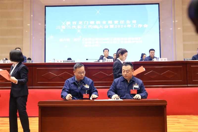 馮偉代表行政方與薛社康代表職工方簽訂了《龍鋼公司2024年工資集體協(xié)商協(xié)議》《2024年女職工權(quán)益保護(hù)專項(xiàng)集體合同》。