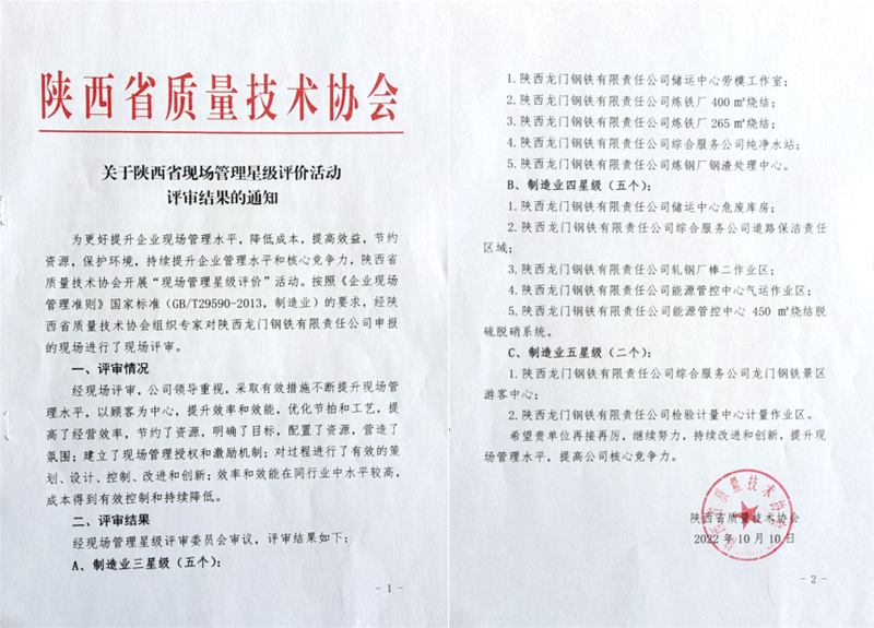 龍鋼公司深入推進現(xiàn)場管理星級達(dá)標(biāo)工作,認(rèn)真策劃部署,常態(tài)化開展6S考評、六個一、對標(biāo)交流、“六個百分之百”活動,按照“零容忍、無死角、全覆蓋”要求,圍繞環(huán)保攻堅過程、生產(chǎn)實際和文明施工中存在問題,相互對標(biāo)、系統(tǒng)治理,持續(xù)鞏固,實現(xiàn)現(xiàn)場管理共同提升。模擬開展林業(yè)碳匯造林項目,傳播綠色低碳生態(tài)理念,將產(chǎn)業(yè)結(jié)構(gòu)與生態(tài)經(jīng)濟相結(jié)合,大力開展植樹造林,增加綠地面積,提高綠化覆蓋率,落實綠化專業(yè)管護,加強綠化養(yǎng)護精細(xì)管理,保障苗木茁壯生長,提升綠化效果。2022年,經(jīng)陜西省質(zhì)量技術(shù)協(xié)會現(xiàn)場星級評價,龍鋼榮獲省級星級現(xiàn)場12個(五星級2個,四星級5個,三星級5個),成為陜西省榮獲星級現(xiàn)場最多的企業(yè),并榮獲“省級園林式單位”稱號。