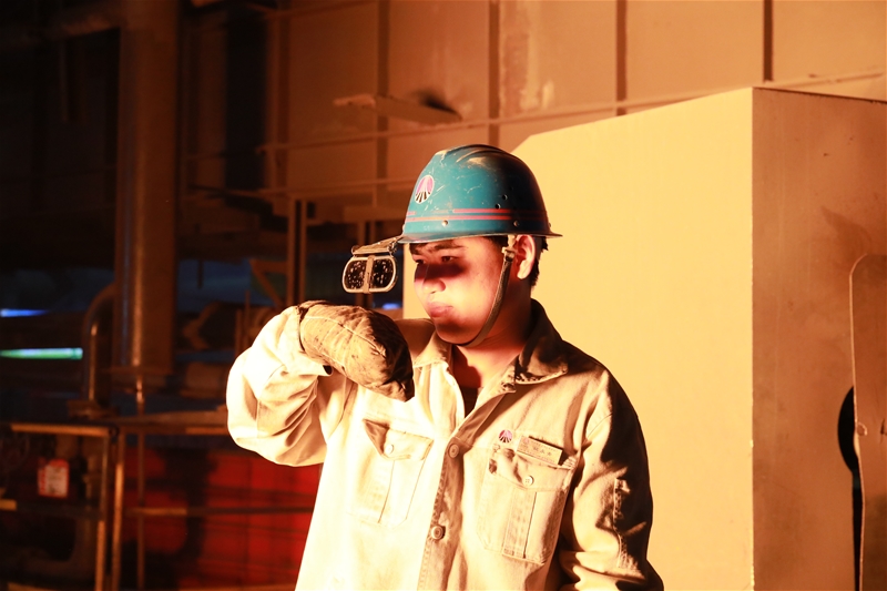 8點30分,6#轉(zhuǎn)爐操作室內(nèi),姚永青正全神貫注地扳動操縱桿,室外的轉(zhuǎn)爐緩緩轉(zhuǎn)動。頓時,一股灼人的熱浪逼來,轉(zhuǎn)爐張開“火”盆大口,內(nèi)壁像巖漿表面隨時能噴出火來。刺眼的紅光逼得人睜不開眼睛,姚永青卻專注地盯著火紅的爐膛,認真地觀察爐況。一眨眼的功夫,姚永青已經(jīng)沖到了爐前。再回來時,他的汗正順著頭發(fā)往下滴,衣服已經(jīng)被汗水浸透。據(jù)了解,這樣的工作,他每天要重復(fù)十幾次。