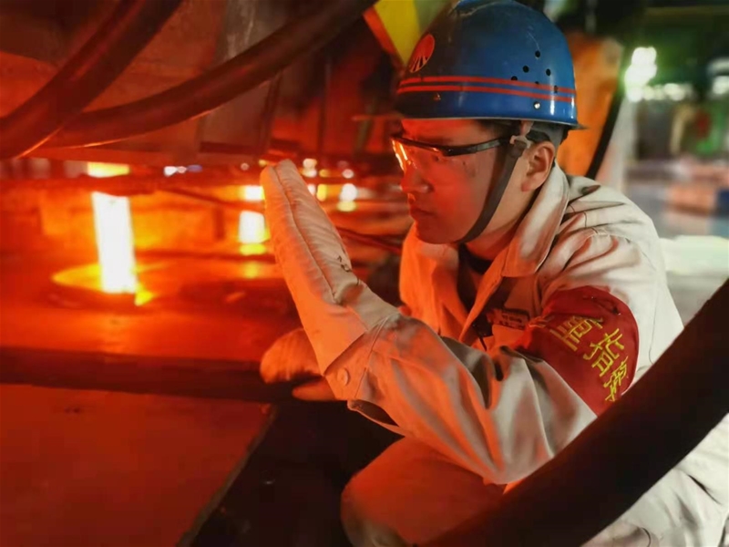 走進(jìn)澆鋼區(qū),一股熱浪迅速將人包裹起來。八個(gè)鋼流在火紅的套管中穿過,平穩(wěn)有序。一名中包工手里握著小鏟子,徘徊在八個(gè)流之間,仔細(xì)觀察著每個(gè)流次的澆注情況,時(shí)不時(shí)地將保護(hù)渣加入結(jié)晶器內(nèi);另一名中包工拿著工具半蹲在七流前,準(zhǔn)備將到期的中包套管卸下。“快、快、快”,一名穿著防護(hù)服的中包工提著烤得發(fā)紅的中包套管快速向七流奔去。就在這時(shí),舊套管快速卸下,新套管立即戴上,瞬間鋼花四濺、璀璨奪目。自實(shí)施全保護(hù)澆注以來,他們嚴(yán)格按照中包套管使用時(shí)間進(jìn)行更換,防止鋼水在澆注過程中氧化,保證鑄坯質(zhì)量100分。