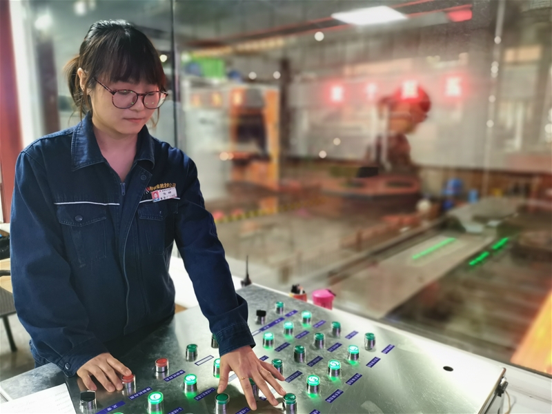 操作室內(nèi),推鋼工焦娜站在操作臺(tái)前,一會(huì)抬頭看顯示器,一會(huì)俯視臺(tái)下輥道,指尖在布滿各色按鈕的操作臺(tái)上“跳舞”,她認(rèn)真的樣子,是一道獨(dú)特的風(fēng)景,宛若一縷春風(fēng),溫暖而淡然。推鋼工作看似簡(jiǎn)單,實(shí)則不然。連鑄新區(qū)承擔(dān)著連鑄生產(chǎn)的重要任務(wù),對(duì)她們來說八機(jī)八流生產(chǎn)是不小的考驗(yàn),是對(duì)眼力、手力、耐力、心理的考驗(yàn),操作臺(tái)上各色的按鈕、各種票據(jù)、記錄,她們一樣都不馬虎,雖然工作難度大,但這群娘子軍們用她們的細(xì)心,完美勝任了這項(xiàng)極具挑戰(zhàn)的工作。