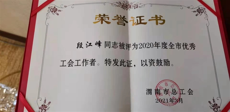 3月16日,在渭南市總工會(huì)二屆十四次全委(擴(kuò)大)會(huì)上,龍鋼公司工會(huì)工作榮獲市總工會(huì)多項(xiàng)榮譽(yù),并現(xiàn)場(chǎng)受到了表彰。龍鋼公司工會(huì)榮獲“工會(huì)在您身邊竭誠為您服務(wù)”主題活動(dòng)創(chuàng)新服務(wù)一等獎(jiǎng)和“基層示范點(diǎn)”榮譽(yù)稱號(hào),段江峰榮獲2020年度全市優(yōu)秀工會(huì)工作者。
