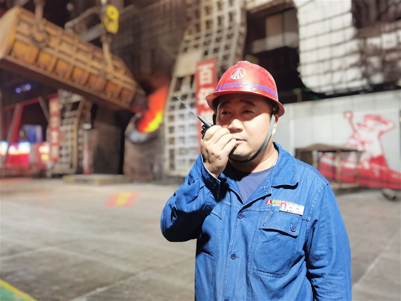 “李林,1#轉(zhuǎn)爐現(xiàn)在出鋼,請?zhí)崆胺描F水……”下午6點(diǎn),調(diào)度錢俊脖子上掛著秒表,手里拿著對講機(jī),全副武裝,一會兒提醒混鐵爐鐵水情況,一會兒查看各爐子冶煉周期是否達(dá)標(biāo),一會兒又安排爐子粘大面……在他的組織協(xié)調(diào)下,老區(qū)生產(chǎn)秩序井然,員工士氣熱情高漲。此時(shí)此刻,爐臺上的溫度已高達(dá)50℃,滿身的汗水不停往下淌,他卻不理會,依然指揮著、協(xié)調(diào)著,與炙烤戰(zhàn)斗,盡自己的最大力量保證當(dāng)班生產(chǎn)順行。