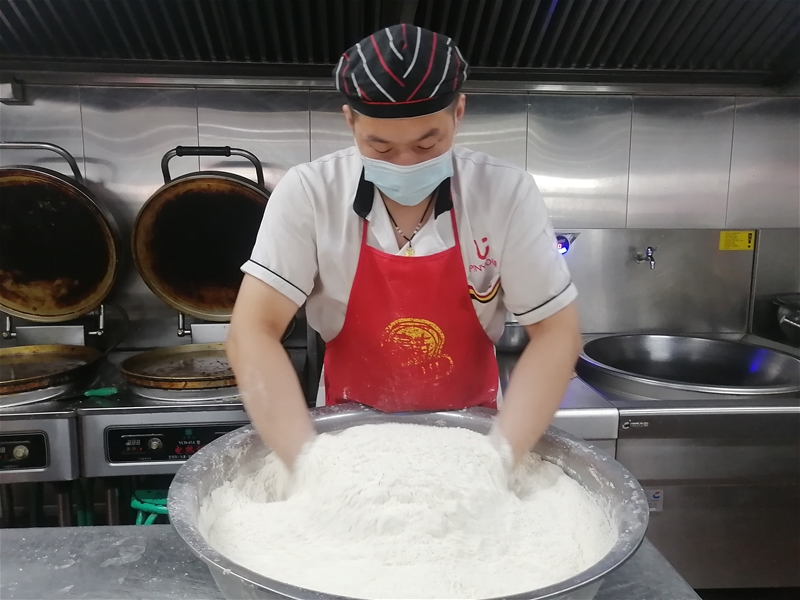 開始做午餐的各項準備工作:清洗、切配、砍骨頭、切肉、揉面等等,隨著爐灶排風機的啟動,灶臺旁的廚師們開始了午餐的精心烹飪。