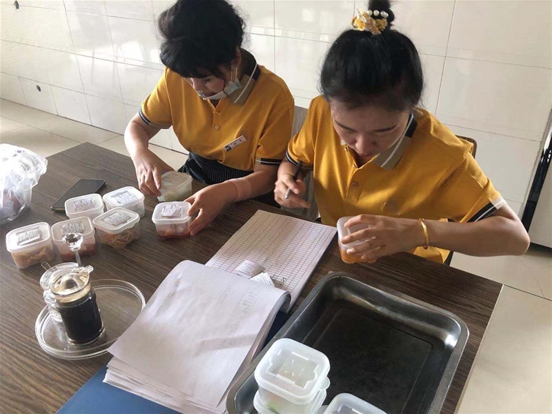 白色的廂式車按時配送來當日食材,廚師長和核算人員認真仔細對食材數(shù)量、質(zhì)量、品種進行清點、稱重、登記、核對,確保食材安全。