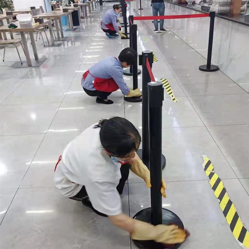 用餐人群散去,工作人員各司其職:廚師、幫廚準備晚餐原料、清理設備、食品分類存放;保潔洗消人員按要求清洗餐具、理桌、拖地,整理料盅……豎立的砧板、整齊排放的桌椅、分色規(guī)范放置的抹布和空氣中散發(fā)的消毒氣味……午餐供應結(jié)束了。