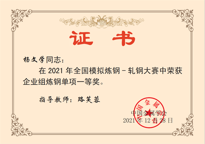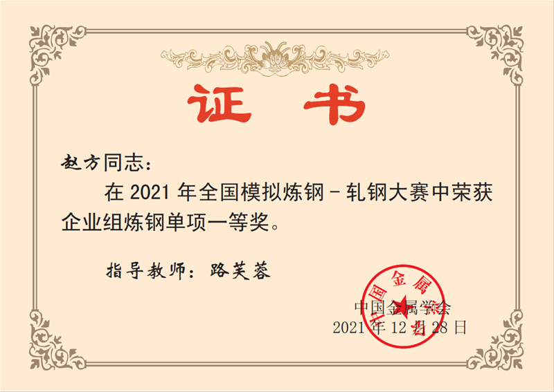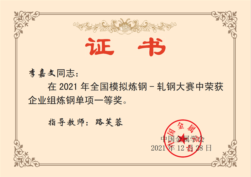 近日,從中國(guó)金屬學(xué)會(huì)傳來(lái)喜訊,公司煉鋼廠轉(zhuǎn)二作業(yè)區(qū)技術(shù)主管楊文學(xué)、煉鋼廠3#轉(zhuǎn)爐煉鋼工趙方、煉鋼廠5#轉(zhuǎn)爐煉鋼工李嘉文3名同志在2021年全國(guó)模擬煉鋼-軋鋼大賽中均榮獲企業(yè)組煉鋼單項(xiàng)一等獎(jiǎng)。
