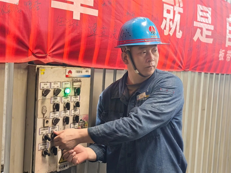 上午8:10,激烈而緊張的換輥“競(jìng)賽”正式開始,只見“參賽者”的身影穿梭在現(xiàn)場(chǎng),仿佛4×100游泳接力賽場(chǎng)上你追我趕的運(yùn)動(dòng)員。軋鋼工緊密協(xié)作,動(dòng)作嫻熟,每一個(gè)步驟都精準(zhǔn)無誤。王煜和范宇坤負(fù)責(zé)拆卸舊輥,并配合天車工將需要更換的軋輥慢慢從軋機(jī)中抽出來,放置在下線軋輥指定地點(diǎn)。李陽(yáng)和楊延博配合默契,負(fù)責(zé)吊運(yùn)新輥以及安裝調(diào)試工作,只見一人負(fù)責(zé)操作箱操作,一人根據(jù)其指示小心翼翼地操作按鈕,調(diào)試后再仔細(xì)檢查,確保導(dǎo)衛(wèi)和除塵水管完好無損。精軋班長(zhǎng)蓋俊生則負(fù)責(zé)檢查換輥質(zhì)量,整個(gè)過程每一個(gè)人都恪盡職守、全力以赴,每一個(gè)環(huán)節(jié)都如同接力賽中的一棒,傳遞著責(zé)任與使命。