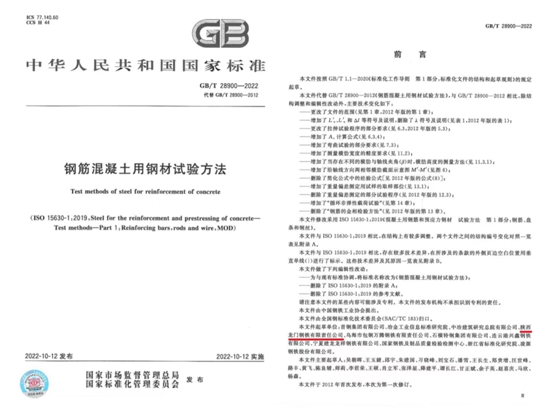 近日,由龍鋼公司參與起草的《GB/T28900-2022鋼筋混凝土用鋼材試驗(yàn)方法》正式發(fā)布。