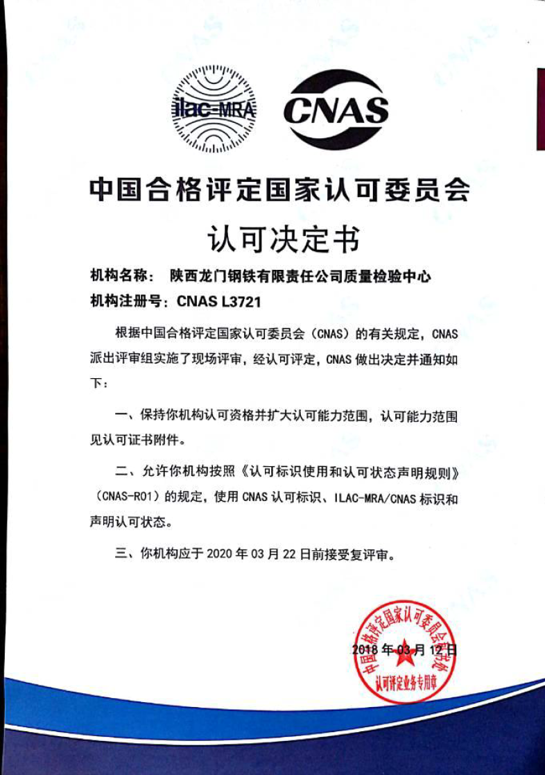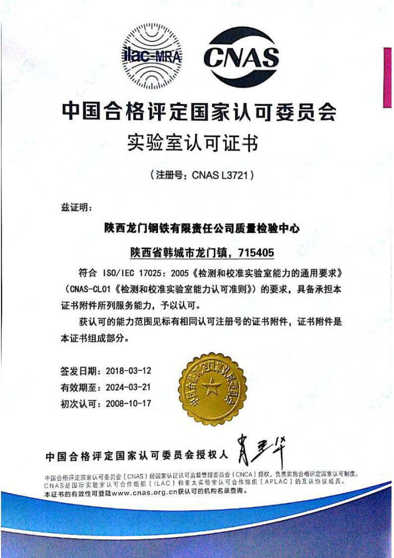 龍鋼公司能源檢計(jì)量中心質(zhì)量檢驗(yàn)中心擁有進(jìn)口X-熒光儀、真空直讀光譜儀、紅外碳硫儀、全自動(dòng)工業(yè)分析儀、熱反應(yīng)測(cè)定儀、煤質(zhì)巖相儀、電液伺服萬(wàn)能試驗(yàn)機(jī)、鋼筋彎曲和反彎試驗(yàn)機(jī)、維氏硬度計(jì)、金相顯微鏡、掃描電鏡、氧氮?dú)鋬x等質(zhì)量控制檢驗(yàn)檢測(cè)設(shè)備,整體裝備水平處于國(guó)內(nèi)領(lǐng)先地位。2008年,公司質(zhì)量檢驗(yàn)中心獲得國(guó)家實(shí)驗(yàn)室認(rèn)可證書(shū),并連年通過(guò)國(guó)家認(rèn)可審核及標(biāo)準(zhǔn)能力檢測(cè)驗(yàn)證。