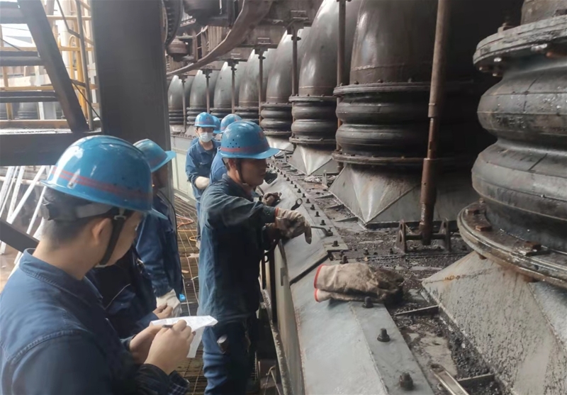 圖二:高爐崗位職工在對爐頂?shù)臍饷芟?、儀表儀器等關(guān)鍵生產(chǎn)設(shè)備進行檢查,做好精密儀器的防潮、防雨工作,確保生產(chǎn)系統(tǒng)穩(wěn)定順行。