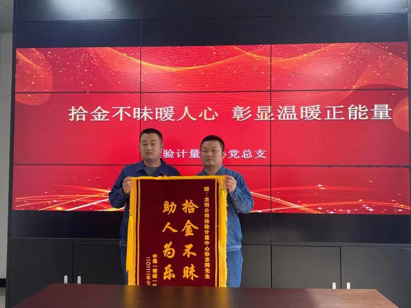 7月24日,王師傅為孫京輝送來一面“拾金不昧 助人為樂”的錦旗,并激動地說道:“龍鋼公司的職工,素質(zhì)真高,為你們點贊!”