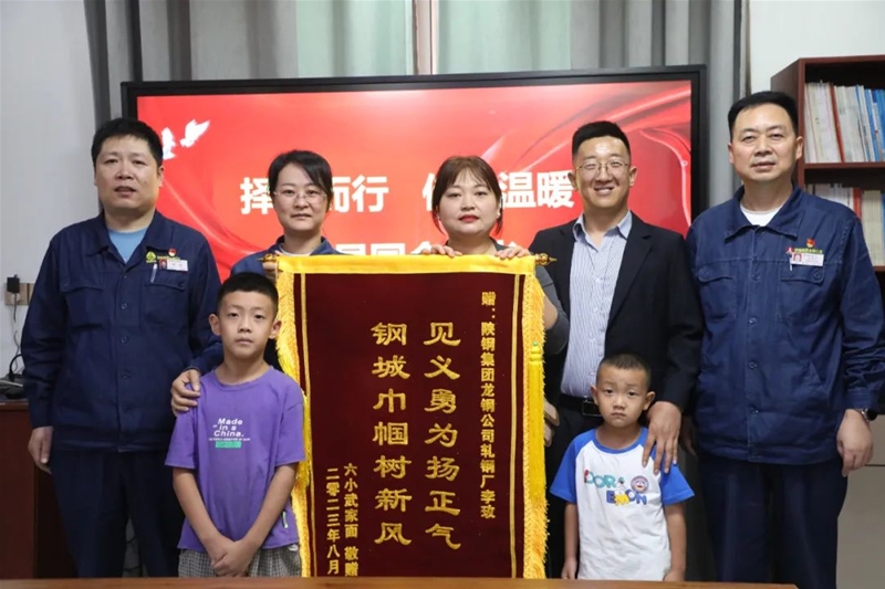 “兒子說,讓我一定要找到阿姨,是這個阿姨救了我們一家,我們要給阿姨送一面錦旗。”8月30日,韓城一家面館老板攜全家為軋鋼廠職工李玫送來一面錦旗,錦旗上“見義勇為揚正氣鋼城巾幗樹新風”十四個大字格外醒目。