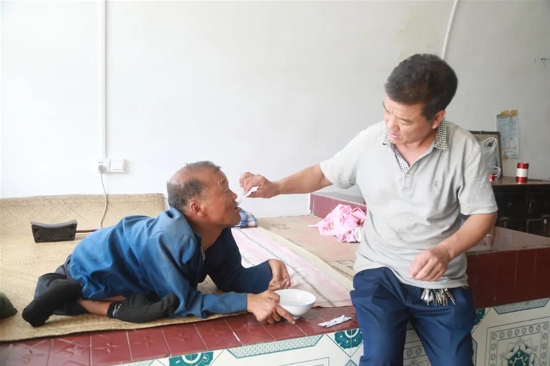 他的哥哥打小患有小兒麻痹癥,只能坐在自制小輪車上活動。自懂事起,同邦棟就為哥哥端吃端喝、洗臉擦身。2006年,父親病重,彌留之際囑托他,不管遇到什么困難,一定要照顧好哥哥。然而,在這個家最需要照顧的時候,同邦棟的妻子卻因承受不了如此重?fù)?dān),留下孩子離婚了,給這個殘破的家又一記致命打擊。從此,哥哥和年幼的孩子就成了同邦棟的全部。夏日大院沖涼,冬季暖房洗澡,哥哥的吃喝拉撒,吃穿住行,成了他的心頭牽掛,每次上班前都把幾天的飯菜、水果和生活用品準(zhǔn)備充足。2015年哥哥尿結(jié)石住院,他緊緊巴巴湊出3000元住院費(fèi),三天三夜,寸步不離。為了自己不在家哥哥能更好生活,他自己琢磨,從廢品收購站找來舊轱轆、電瓶,找到電焊鋪?zhàn)?,為哥哥焊制了一輛自制的電動輪椅車。一次寒冬夜里,哥哥差點(diǎn)被鎖在門外,為此,他省吃儉用,為哥哥蓋了一間帶電動門的門房,方便進(jìn)出。日復(fù)一日、年復(fù)一年,這一堅(jiān)持就是近40余載。