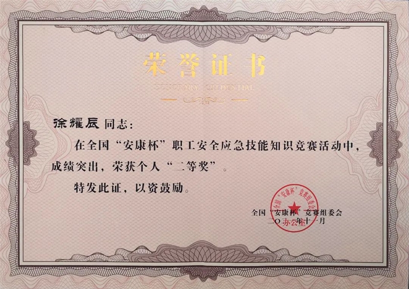 近日,公司喜獲全國(guó)“安康杯”職工安全應(yīng)急技能知識(shí)競(jìng)賽活動(dòng)“優(yōu)秀組織單位”榮譽(yù)稱號(hào)。公司職工徐耀辰榮獲二等獎(jiǎng)。