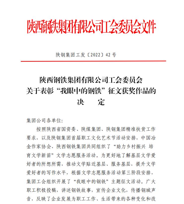 公司多篇征文在陜鋼集團“我眼中的鋼鐵”主題征文活動中獲獎