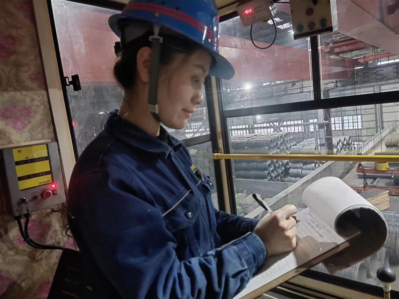 2019年9月,作為新入職大學(xué)生的她加入軋鋼廠天車工這個(gè)大家庭。身為學(xué)徒,在看到師傅第一時(shí)間處理軋線飛鋼的從容時(shí),她便在心里默默立下目標(biāo):“我要抓緊時(shí)間努力練習(xí),爭(zhēng)取早日出師,做獨(dú)當(dāng)一面的員工。”于是,在后來的學(xué)習(xí)中,她盡可能地抓住每一次可以練習(xí)穩(wěn)鉤、開車的機(jī)會(huì),買飯的路上風(fēng)馳電掣,打掃衛(wèi)生馬不解鞍。為減少如廁次數(shù),她盡量少喝水,有時(shí)甚至幾個(gè)小時(shí)都不喝水。在崗的時(shí)間被她合理安排,下班之后她仍然堅(jiān)持學(xué)習(xí),穩(wěn)扎穩(wěn)打的基本功在她的爭(zhēng)分奪秒中迅速得到提升。帶著進(jìn)廠時(shí)的初心,她成為同一批學(xué)徒中最早出師的女天車工。