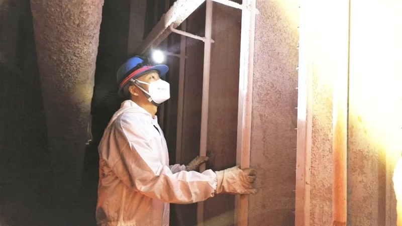 在完成通風(fēng)、氧含量和有害氣體檢測合格后,閆剛強“全副武裝”,對自己的勞護用品和安全工器具再一次確認(rèn),帶頭鉆進(jìn)40cm×50cm的長方形人孔門,身著密不透風(fēng)的防塵服穿梭在40℃的電場內(nèi)部。兩臺除塵器8個電場的檢查任務(wù),讓他已無暇顧及艱苦的作業(yè)環(huán)境,僅半個電場就有21排極線、22排極板、22個振打錘。每一個他都要檢查陰極線有無彎曲斷裂、陽極板有無脫槽、定位板有無脫落,振打錘有無磨損……確?;芈吠暾蛯?dǎo)線連接牢固。